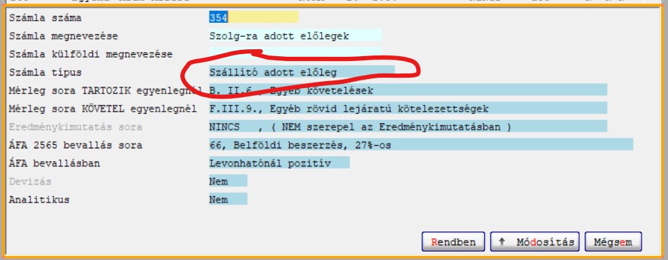 Az Alapadatok >> Számlatükör megadása menüpontban jelöljük ki azokat a főkönyvi számlákat, amelyekre előleget fogunk könyvelni.