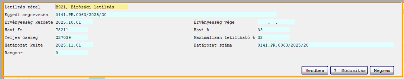 - Maximálisan letiltható %: erre az egy letiltásra vonatkozó korlát (általában 33%, gyerektartás 50%, de)