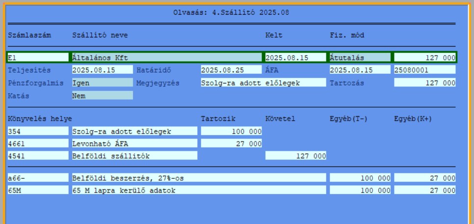 Szállítói számla esetén az előlegszámlát szállító számlának könyveljük, de az 5/8 számlaosztály helyett az adott előlegekre könyveljük a nettó értéket.