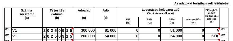 Ennek a számlának az áfája a bevallás M lapjára két sorba kerül be. Az egyik sorban a végszámla teljes értékével szerepel az (e) oszlopban "V" jelöléssel, a másik sorban az előleggel csökkentett értékkel az (e) oszlopban "KÜL" jelöléssel.